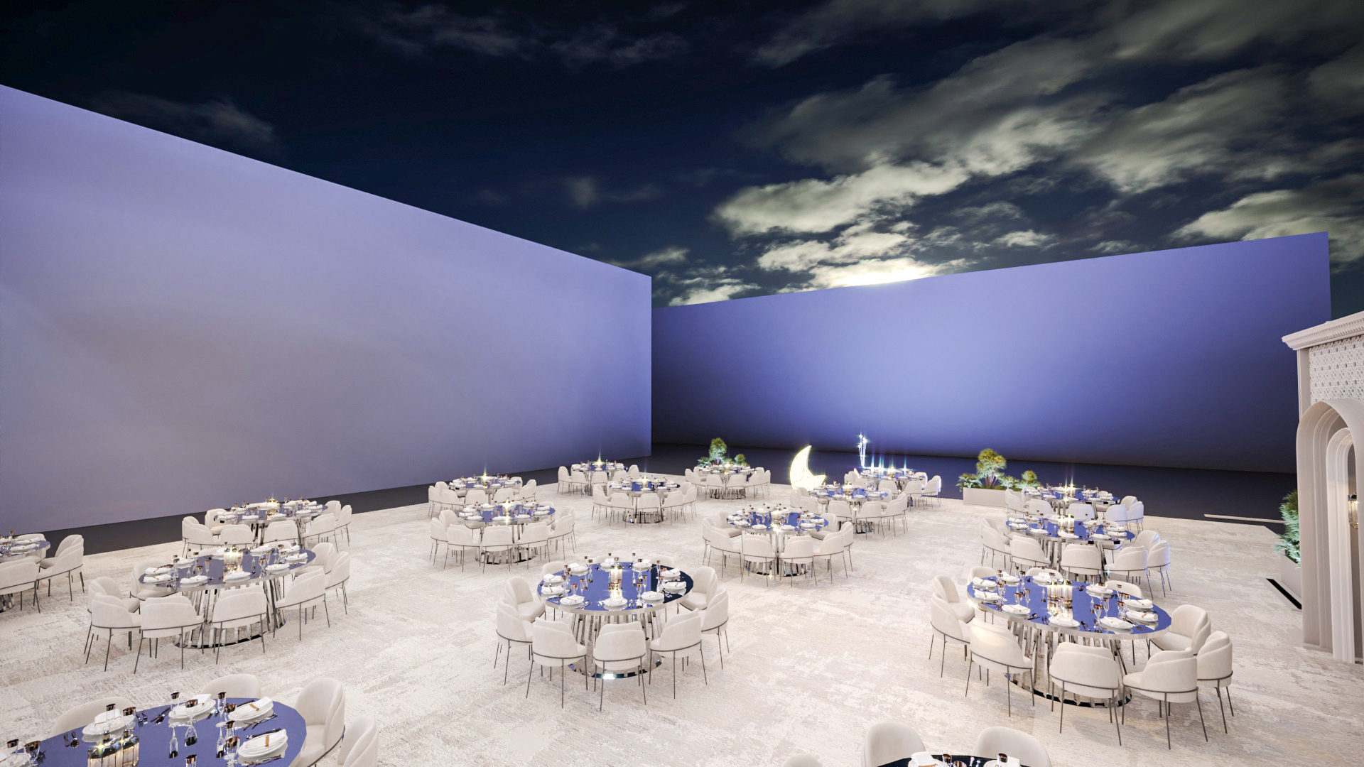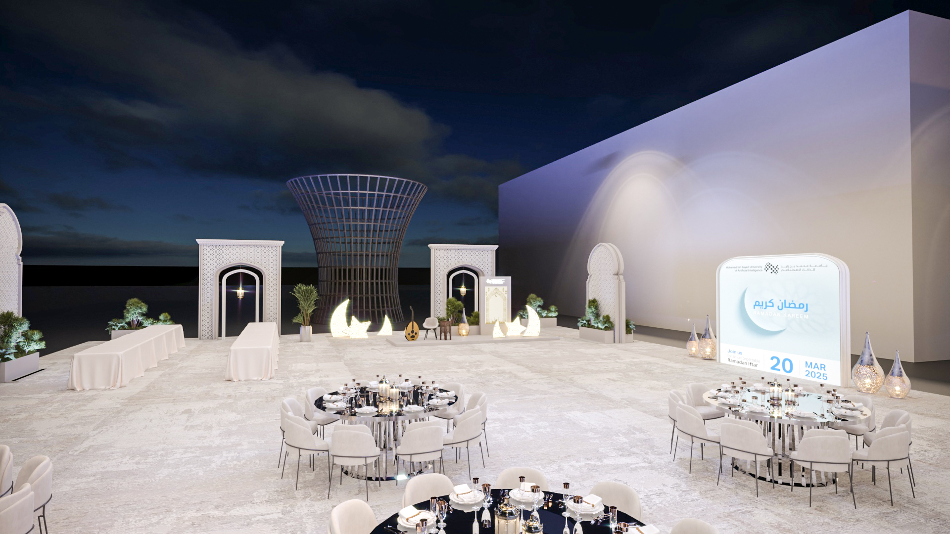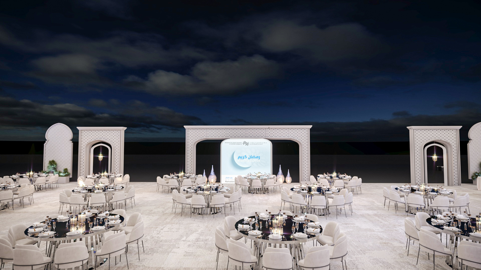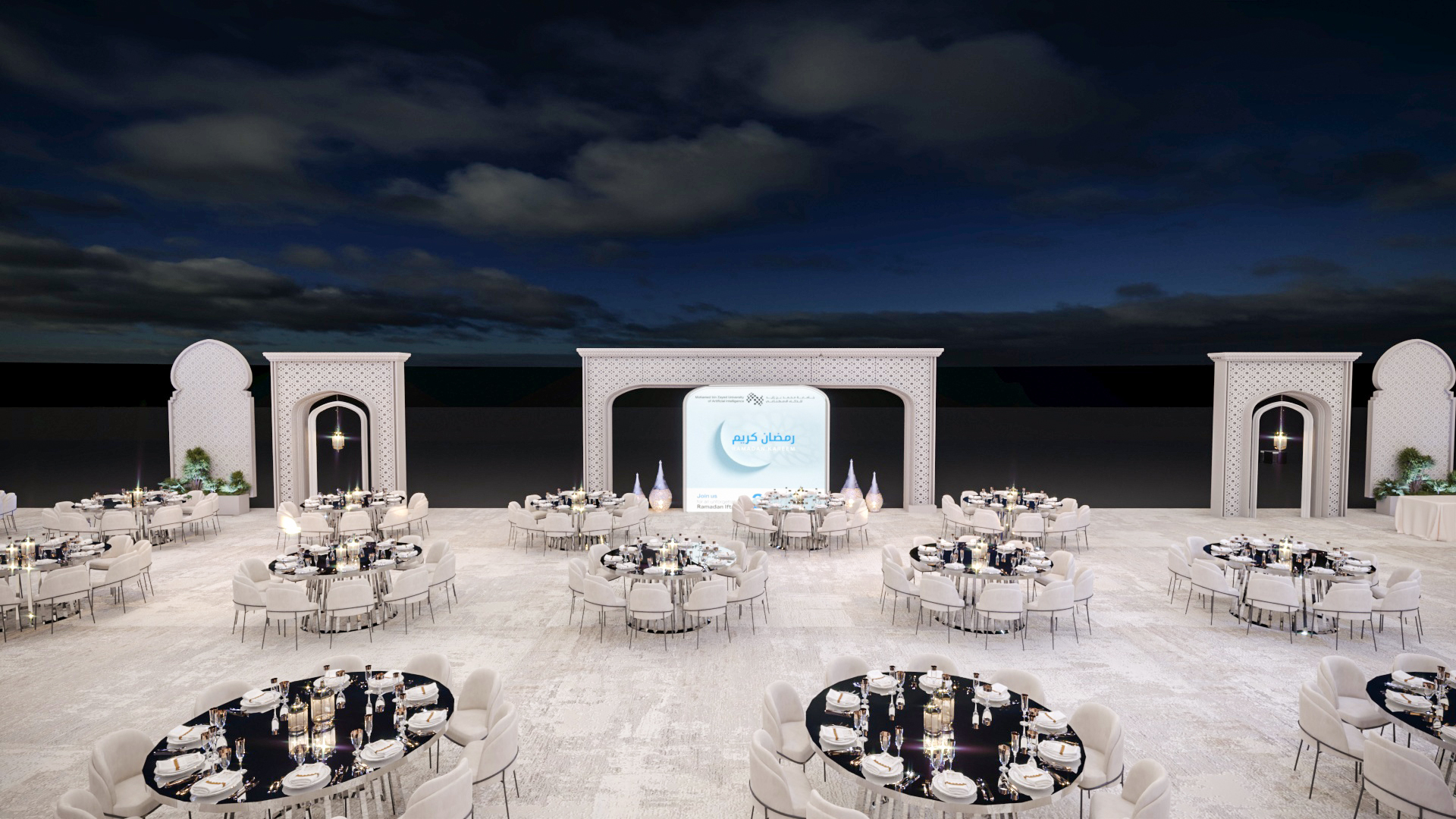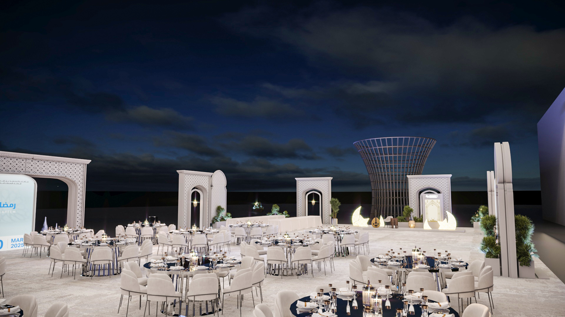 This elegant outdoor event setup, likely for Ramadan, features numerous round tables with white chairs, decorative archways, and illuminated crescent moon and star motifs. A central display screen complements the sophisticated and festive ambiance under the night sky.