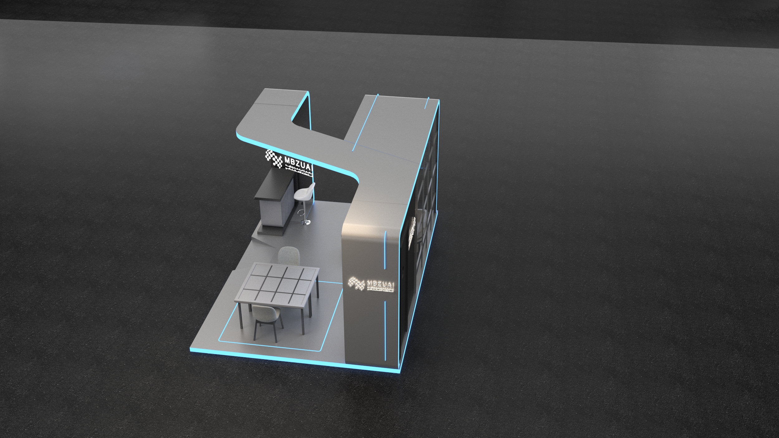 This is a modern exhibition booth design for "MBZUAI" featuring sleek black and grey elements accented with vibrant blue LED lighting. The booth incorporates multiple large screens for digital displays, a welcoming reception desk, and distinct zones for casual lounge seating and more formal table discussions, creating a versatile and engaging space.