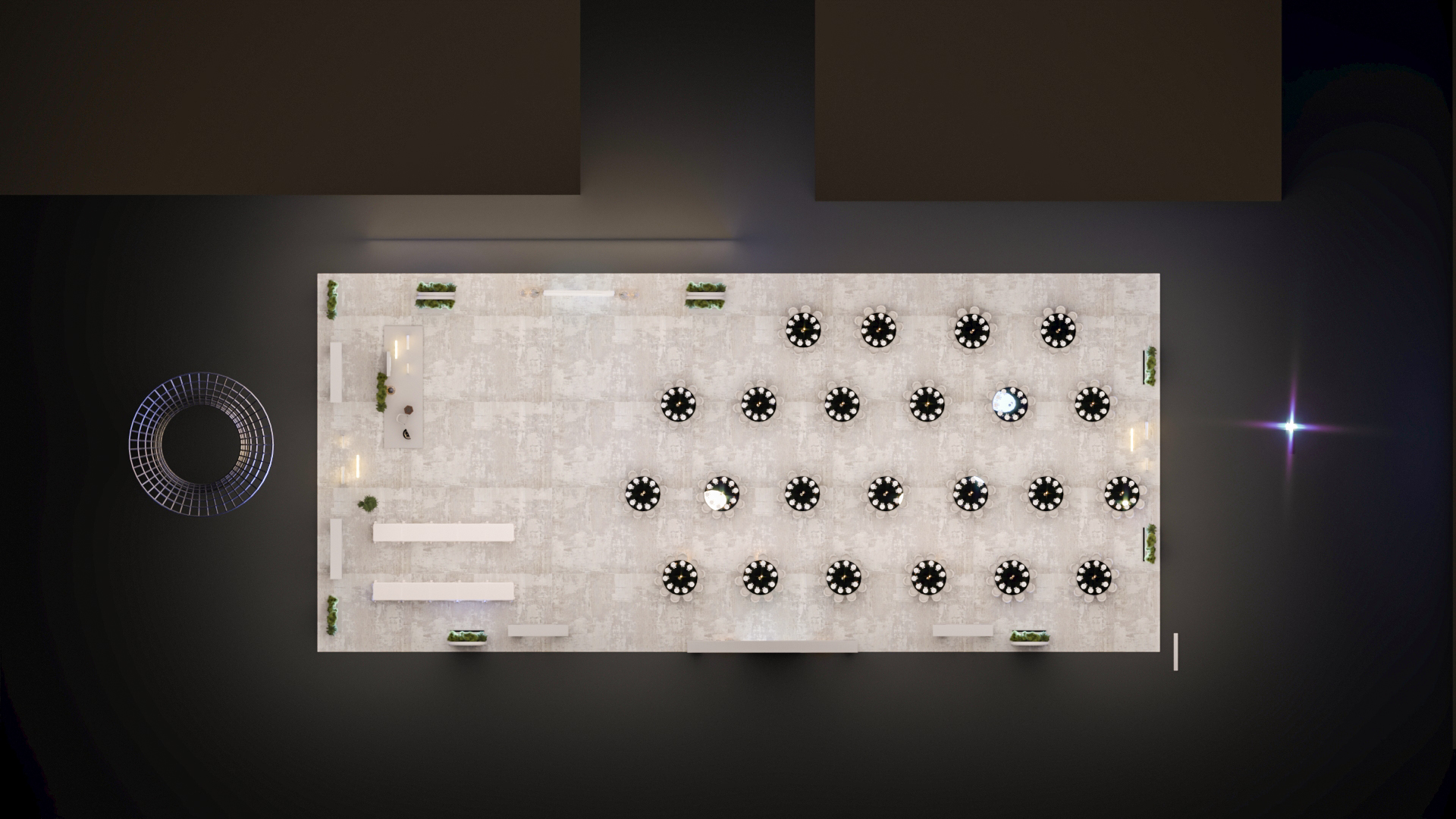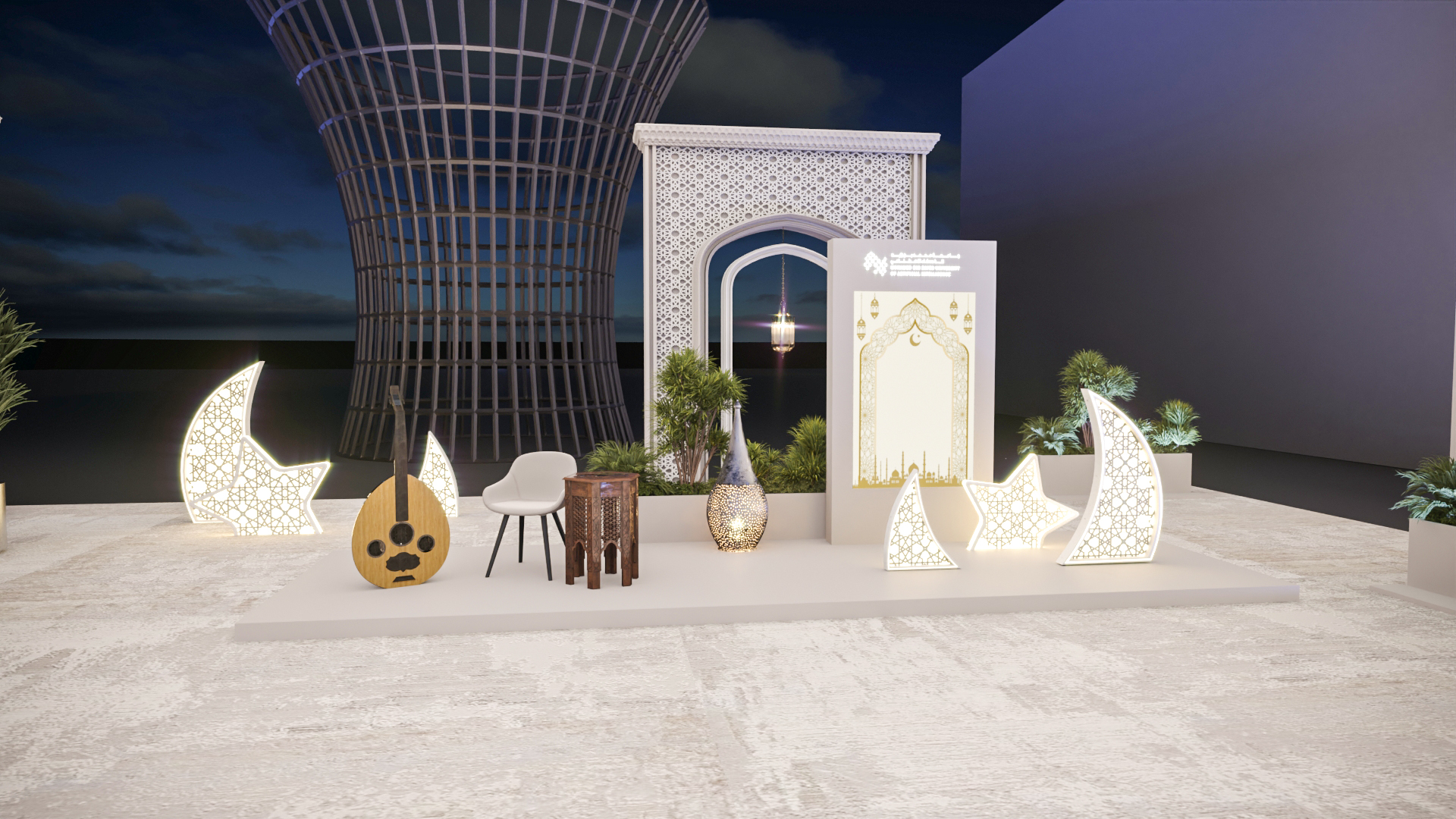 This elegant outdoor event setup, likely for Ramadan, features numerous round tables with white chairs, decorative archways, and illuminated crescent moon and star motifs. A central display screen complements the sophisticated and festive ambiance under the night sky.